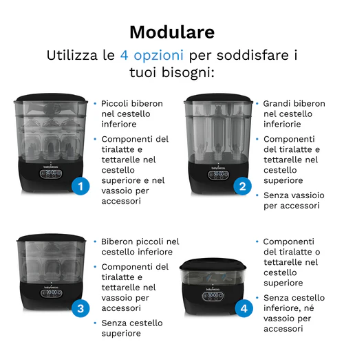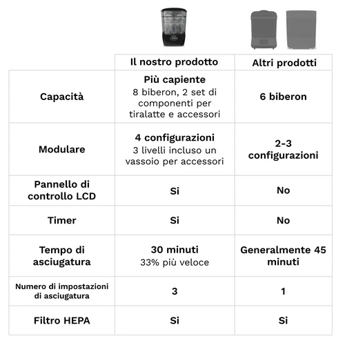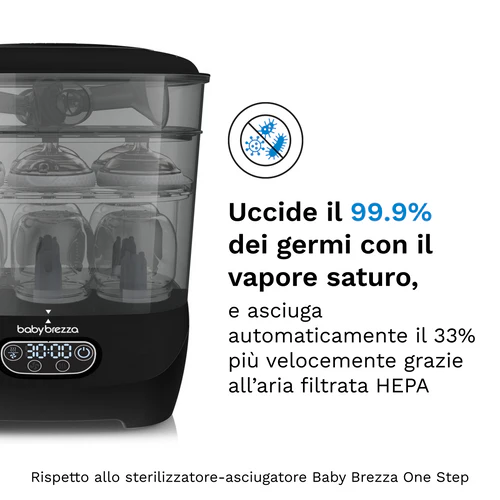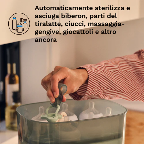 Sterilizza e asciuga automaticamente il 33% più velocemente tutte le marche di biberon,parti del tiralatte e accessori.Il nostro sterilizzatore per biberon utilizza vapore saturo naturale per uccidere il 99.9% dei germi; i prodotti rimangono sterili per 48 ore se lasciati nello sterilizzatore non aperto.