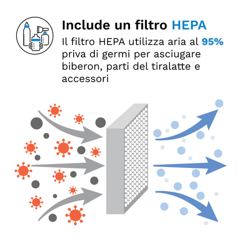 Include un filtro HEPA sostituibile, in modo da asciugare con aria priva di germi.