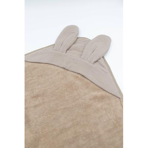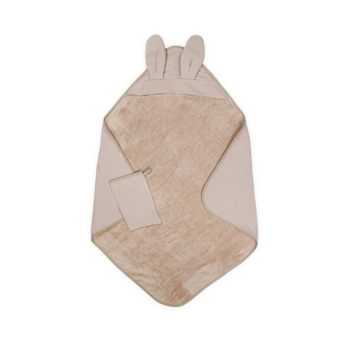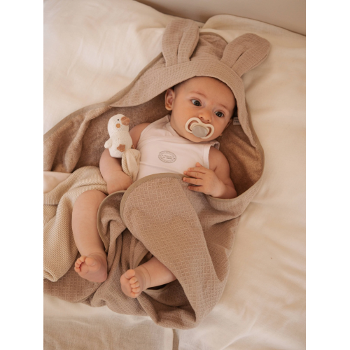 Il tessuto con trama waffle in spugna di bambł e cotone di origine naturale asciuga con dolcezza. Il cappuccio con orecchie dona un dettaglio tenero e divertente, mentre il guanto abbinato permette una pulizia delicata e controllata.
