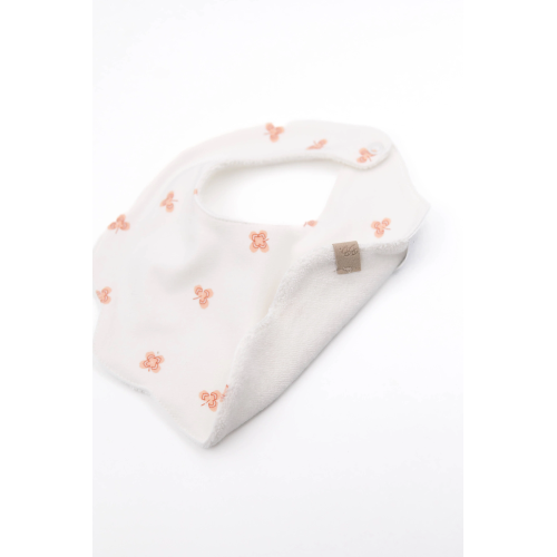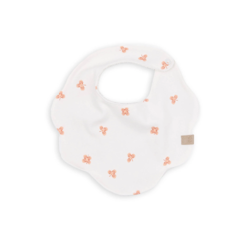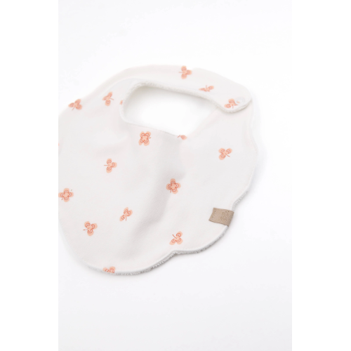 DescrizioneBavaglino dalla forma sagomata a fiore, studiato per offrire una protezione ampia e allo stesso tempo delicata sul torace del bambino.