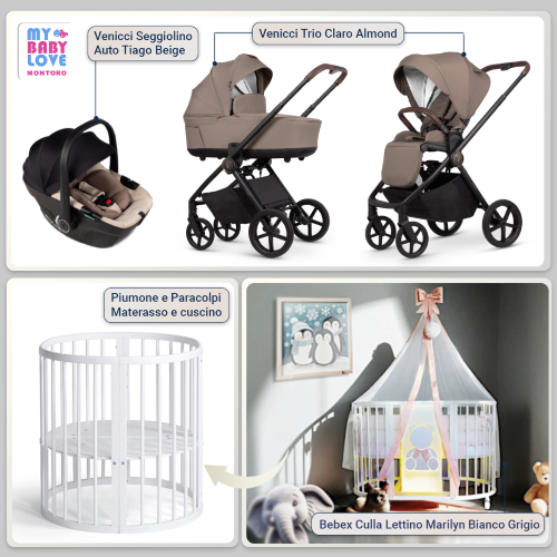 Kit Nascita con Venicci Trio Claro Almond e Cloud Tiago + Bebex Culla Lettino evolutivo Marilyn LED (Almond - LED)