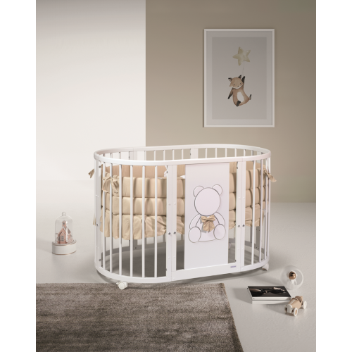 Struttura in legno massello di faggio,4 ruote piroettanti con gomma anti-traccia di cui due con freno,conforme a norma europea EN 716-1: 2008 +A1: 2013,Vernici atossiche,Spigoli arrotondati per massima sicurezza