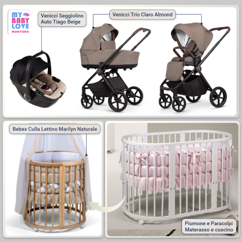 Kit Nascita con Venicci Trio Claro Almond e Cloud Tiago + Bebex Culla Lettino Marilyn Naturale (Almond - Naturale)