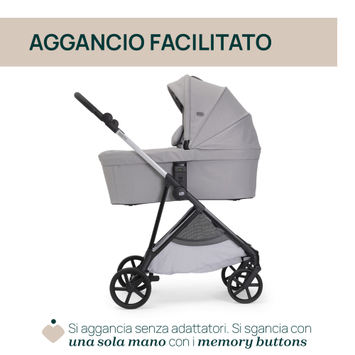 Nel Trio Seety è incluso anche il seggiolino auto Kory Essential i-Size. Puoi agganciarlo direttamente al telaio del passeggino, senza bisogno di adattatori!