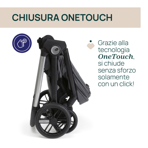 Con Bellagio2 puoi gestire tutto senza fatica, con un solo gesto. Grazie alla tecnologia OneTouch, si chiude da solo con un semplice click! Una volta chiuso, resta in piedi da solo ed è dotato di una pratica maniglia per il trasporto.Il passeggino Bellagio 2 è omologato dalla nascita fino a 22 kg. La seduta è facilmente reversibile, lo schienale si reclina completamente in entrambe le configurazioni ed è regolabile in 4 diverse posizioni con una sola mano.