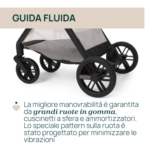Ruote in gomma ad alte prestazioni, cuscinetti a sfera e ammortizzatori per il massimo comfort e maneggevolezza su ogni tipo di terreno.
