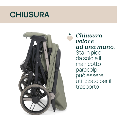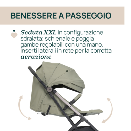 Tessuti soft touch pregiati ed eleganti, arricchiti da dettagli di lusso. Rivestimenti speciali per manicotto, maniglione e poggiagambe. Tubi verniciati in coordinato con i loghi Chicco e gli pneumatici in gomma.