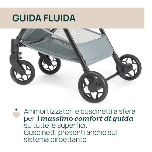 Facile da guidare e comodo su ogni terreno: ammortizzatori su tutte le ruote e cuscinetti a sfera sulle posteiori e sul sistema piroettante. Genitori e bambini si godranno ogni passeggiata