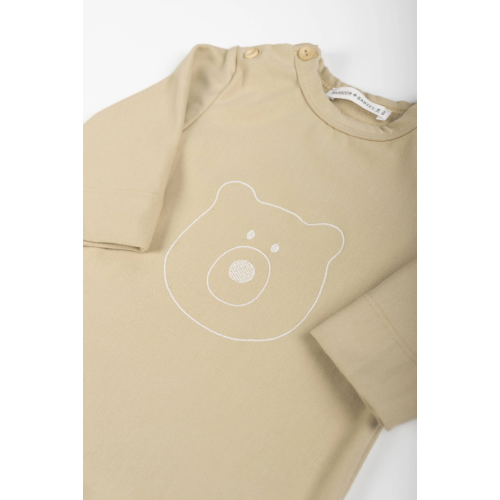 Delicato ricamo frontale a forma di orsetto, essenziale ed elegante, in linea con l’estetica Bamboom